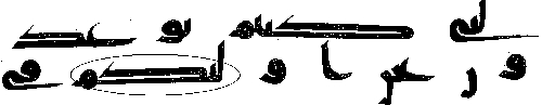 - அதே வரியில், 'மூல' குர்ஆனில் ஒரு காம்பு காணப்படுகிறது, அதோடு கூட "ஜீம்" காணப்படுகிறது, இந்த "ஜீம்" என்ற எழுத்தானது நீண்டுக்கொண்டு சென்றுள்ளது, இவ்வெழுத்து பொதுவாக ஒரு வால் போல மாறி திரும்ப பின்னோக்கி வரவேண்டும், இது நமக்கு எதைக் காட்டுகிறது என்றால், இந்த ஜீம் என்ற எழுத்துக்கு பிறகு வேறு எழுத்து(க்கள்) இருப்பதாக தெரிகிறது. தற்கால அரபிக் குர்ஆனில் இந்த ஜீம் என்ற எழுத்து ஒன்று மட்டுமே காணப்படுகிறது.